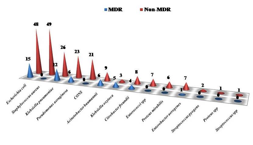 Fig. 8: Species-wise distribution of multi-drug-resistant and nonmulti-drug-resistant organisms