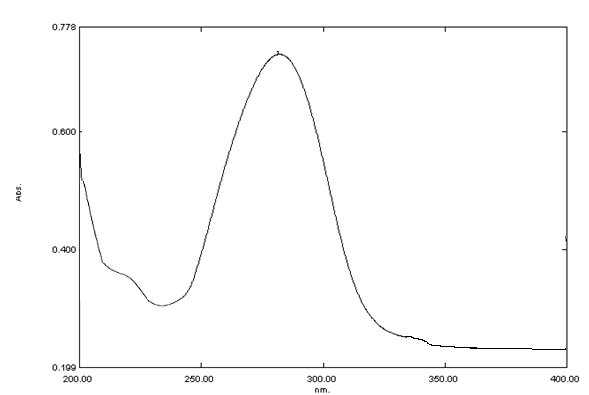 UV spectroscopic method was used to identify lafutidine [5, 6]. Standard solutions of lafutidine were prepared by diluting a known amount of the drug in 0.1N HCl (10, 20, 30, 40, 50, and 60μg/ml). The solutions were subjected to UV spectroscopic scanning to identify λ max of lafutidine. The spectrum was recorded at the 200-400 nm range.
