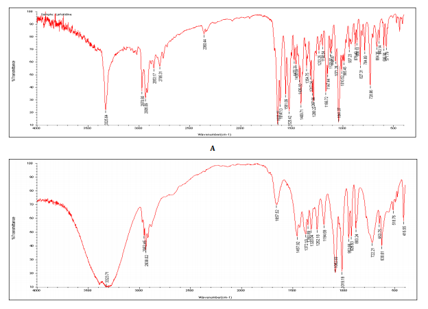 Fourier Transform Infrared Spectroscopy (FTIR) study was conducted to investigate any possible interaction of the drug with polymers used in the formulation preparation. IR spectra for pure lafutidine and with polymer were taken. FTIR spectra was run with the pellets prepared by KBr pellet method of pure drug, and with excipients, were recorded over a range of 4000-400 cm-1 [14].