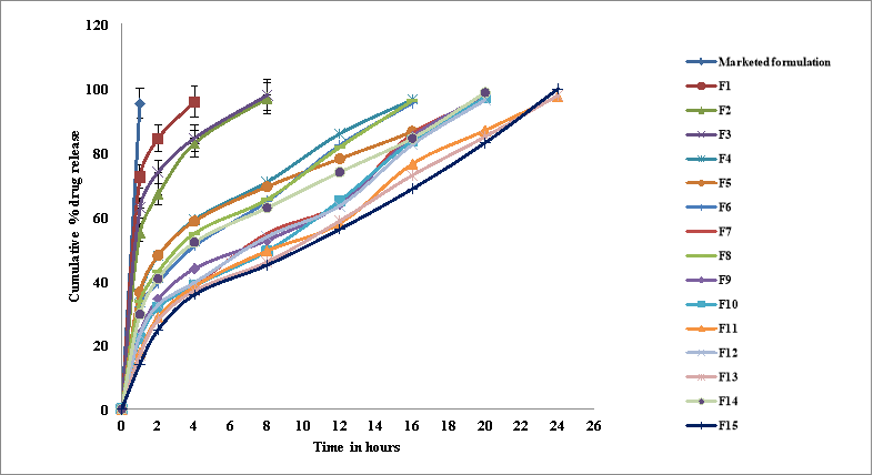 The drug content percentage of formulations (F1-F15) were in the charge 95.46-99.95 (table 4), which indicates that the distribution of the drug is uniform in all the formulations as per the monograph.