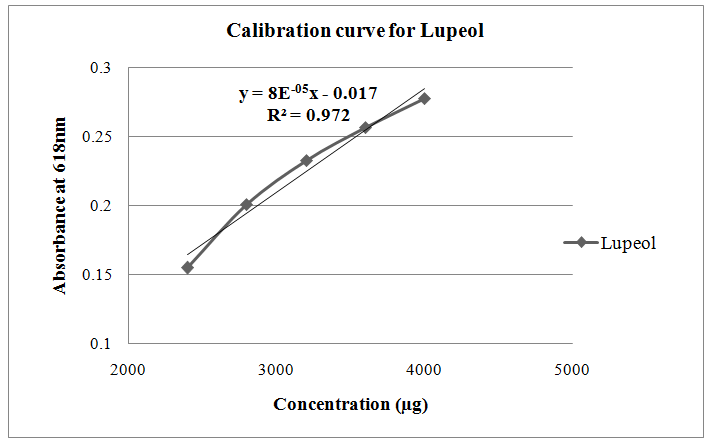 Fig. 1: It shows the calibration curve for lupeol standard from which Total Terpenoid Content of n-hexane extract of M. ferrea stamens was calculated
