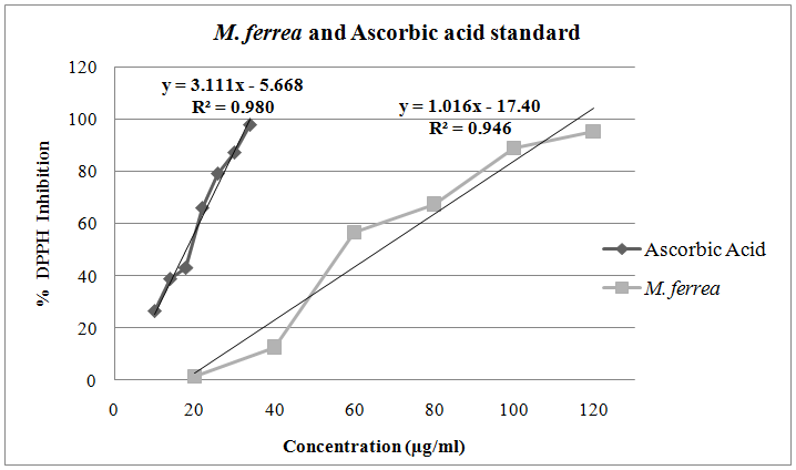 DPPH assay was used for the determination of free radical scavenging potential of n-hexane extract of M. ferrea stamens for which ascorbic acid was used as a standard. The IC50 value of 66.3 µg/ml was obtained for the test extract as compared to the IC50 value of 17.9 µg/ml for the ascorbic acid standard. table 5 shows the % DPPH inhibition values as per concentration for test extract as well as the ascorbic acid standard. fig. 2 illustrates the combined graph for the concentration versus % DPPH inhibition values for the test extract and the ascorbic acid standard.