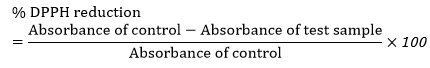 Free radical scavenging activity of n-hexane extract of M. ferrea was evaluated by 2,2-diphenyl-1-picrylhydrazyl (DPPH) Assay. 3.94 mg of DPPH was dissolved in 100 ml of methanol to give 0.1 mM DPPH reagent. Ascorbic acid was used a standard for the assay at concentration range of 10-34 µg/mL. Dried n-hexane extract of M. ferrea dissolved in methanol was used a test solution at a concentration range of 20-120 µg/ml. 3 ml each of the solutions of the test extract was mixed with the 1 ml of the prepared DPPH reagent and allowed to react in dark for 45 minutes at room temperature. Afterwards, the absorbance of all the test mixtures was measured using spectrophotometer (JASCO V-630) at 517 nm. Methanol was used as a blank and methanol (without plant extract) added with DPPH reagent was used a control for the assay. Absorbance values of all the test samples and standards were recorded in triplicates. The free radical scavenging activity was calculated by following formula: