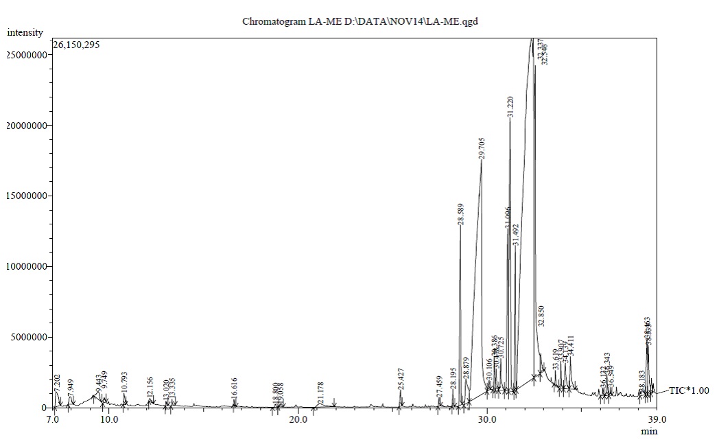 Fig. 2: Chromatogram showing the GC-MS spectrum of L. acidissima fruit methanol (LA-Me) extract