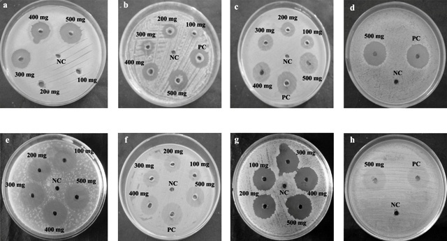 Fig. 3: Effect of Limonia acidissima fruit methanol extract against different clinical pathogens at tested concentrations (100 mg/ml to 500 mg/ml). a) Bacillus cereus, b) Escherichia coli, c) Pseudomonas aeruginosa, d) Staphylococcus aureus, e) Salmonella typhi, f) Shigella dysentriae, g) Vibrio cholerae, h) Klebsiella pneumoniae. PC- Positive control: Ciprofloxacin (0.01 mg/ml), NC- Negative control (DMSO).