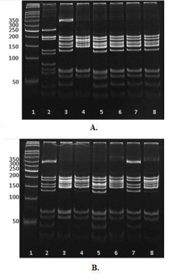 Fig. 1: PCR-RFLP patterns of Aeromonas strains isolated. A)1-DNA ruller 50pb (Ludwig Biotec, Porto Alegre-RS, Brazil), 2-LP01 (A. veronii biovar sobria), 3-LOC02 (A. hydrophila), 4-LP15 (A. caviae), 5-8 LP31, LP35, LP39, LP41 (Aeromonas spp.) B 1-DNA ruller 50pb (Ludwig Biotec, Porto Alegre-RS, Brazil), 2-LOC81 (A. hydrophila), 3-LP95 (A. caviae), 4-LOC121 (Aeromonas spp.), 5-LP126 (Aeromonas spp), 6-LOC190 (A. caviae), 7-LOC313 (A. hydrophila), 8-LOC346 (A. caviae)