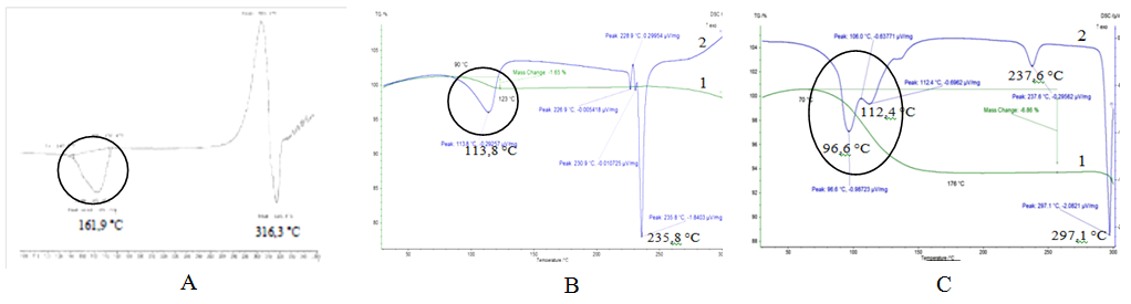 Fig. 2: Thermograms of antibiotics prior to the grinding shows the release of water (indicated by the black circle): A. CM at 161.9 °C, B. LM at 113.8 °C, C. and PMD at 96.6 and 112.4 °C