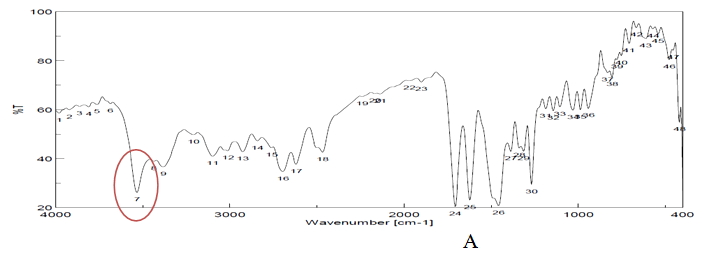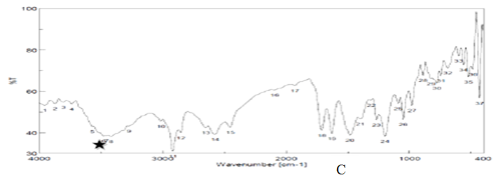 Fig. 3: FTIR Spectra of: A. CM, shows O-H stretch peak at 3550 cm-1; meanwhile, LH (B) and PMD (C) spectras do not show clearly the O-H stretch peak at the IR region for water existing in a hydrate