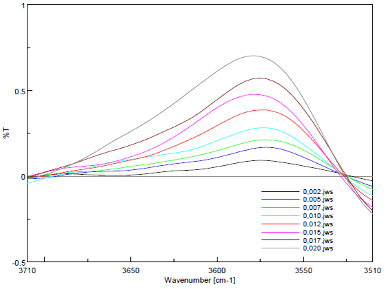 A simple test on precision was conducted. Six samples of 0.010 CM in KBr were analyzed and the AUCs of the O-H hydrate stretch peak derivative were listed in table 2.