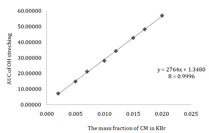 Using AUCs as the Y-axis and mass fractions of CM in KBr as the X-axis, a calibration curve was created. The calibration curve used to calculate the amount of water inside the crystal lattice of CM, based on the magnitude of AUC of O-H hydrate stretch peak derivative (fig. 5).