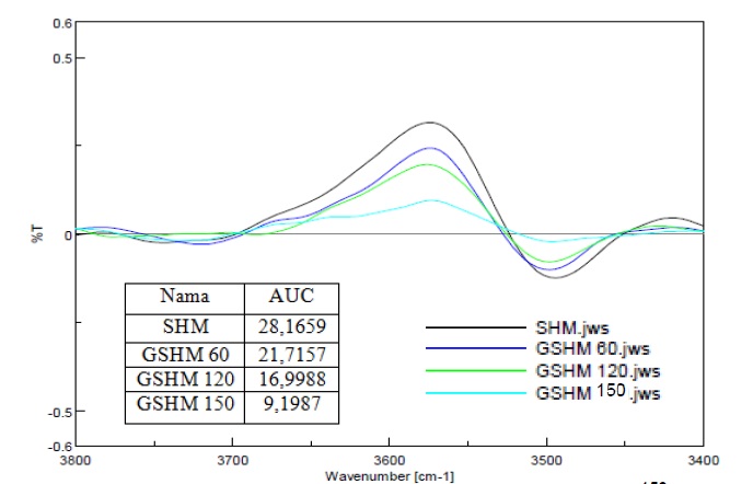 The results above showed that FTIR method was feasible to be used as a way to observe the change of water’s hydrate of CM after the mechanical treatment, which in this case was the grinding. The O-H hydrate stretch IR spectra of the ground CM (GCM), respectively after being ground for 60, 120, and 150 minutes, are shown in fig. 6.