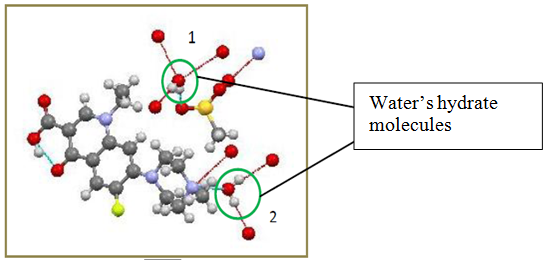 Besides CM and LH, another fluoroquinolone antibiotic used in this study is PMD. In PMD, two water molecules are incorporated into the crystal lattice is not connected with hydrogen bonds (fig. 8).