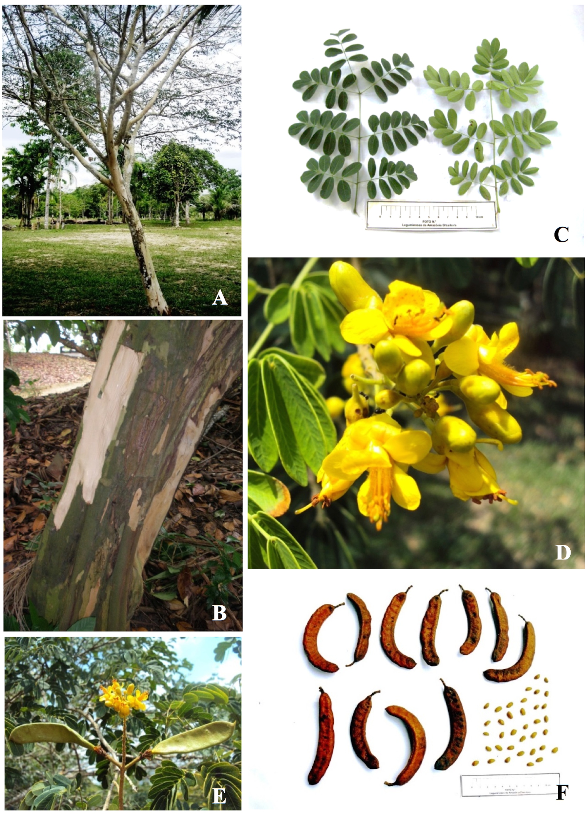 Fig. 1: Images of Libidibia ferreavar. ferrea. A. L. ferrea at collection site. B. Details of trunk. C. Details of leaves. D. Details of flowers. E. Inflorescence and fruits. F. Details of fruits and seeds. Credits of photos: Dr. Luís Souza/INPA