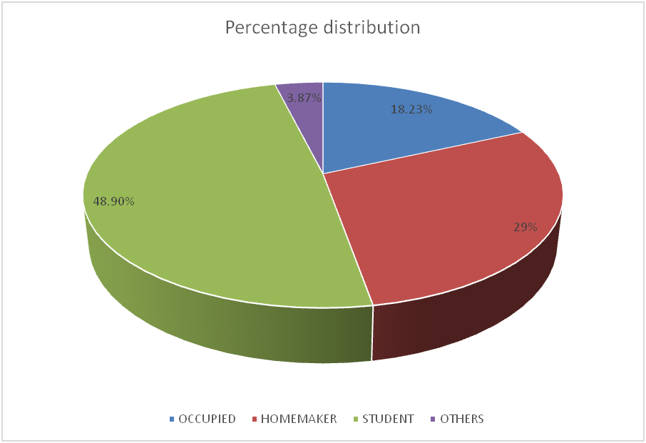 The maximum number of patients belonged to the student category (48.90%) (fig. 1), which accounts for 177. This was followed by homemakers (29%), which constituted about 105. The remaining patients belonged to the occupied group, which was 66 (18.23%) and others came around 14 (3.87%) (*p-value<0.05).