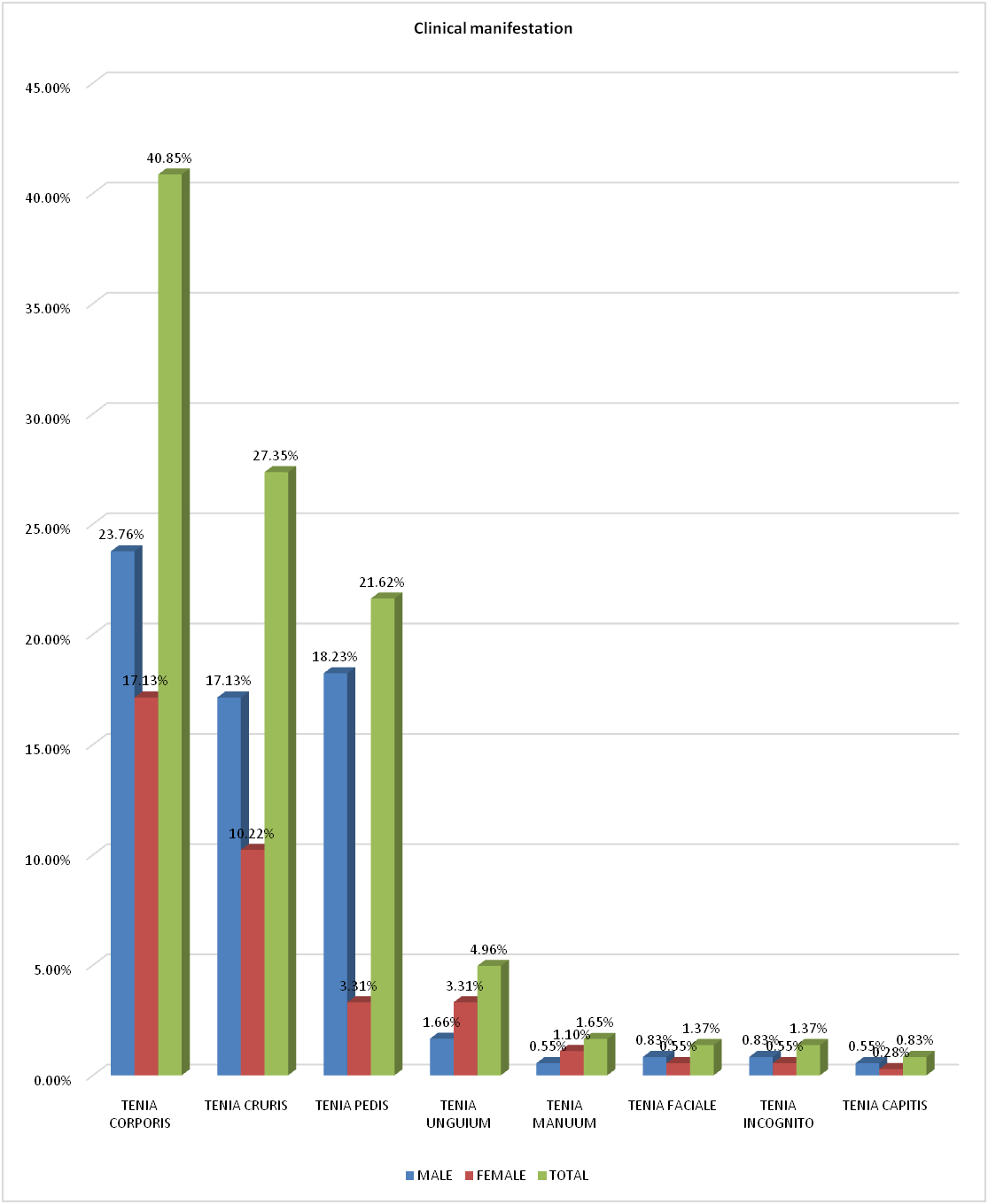 Out of 362 patients diagnosed with dermatophytosis (fig. 2), Tinea corporis (40.85%) was the prominent clinical manifestation of dermatophytosis infection, followed by Tinea cruris (27.53%), Tinea pedis (21.62%), Tinea unguium (4.96%), Tinea manuum (1.65%), Tinea faciale (1.37%), Tinea incognito (1.37%), and Tinea capitis (0.83%).