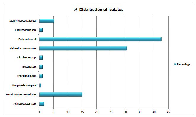 In this study, both gram-negative and gram-positive organisms contributed to urinary tract infections in the study subjects. Out of the total 174 culture isolates, Escherichia coli (42.50%) was predominant, followed by Klebsiella pneumoniae (30.45%), Pseudomonas aeruginosa (14.94%), Staphylococcus aureus (5.17%), Acinetobacter spp (1.72), Proteus spp. (1.15 %), Providencia spp. and Enterococcus spp (1.14%), Citrobacter spp., and Morganella morganii (0.57%) (fig. 1).