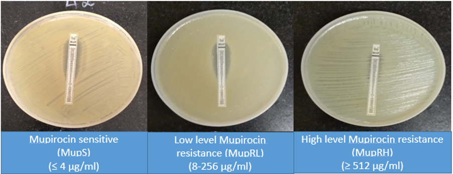 Minimum inhibitory concentration (MIC) breakpoints for mupirocin susceptibility (MupS) isolates is ≤4 µg/ml, low-level mupirocin-resistant (MupRL) isolates are 8–256 µg/ml and high-level mupirocin-resistant (MupRH) isolates is ≥512 µg/ml, as per CLSI [13] (fig. 1). Results were interpreted accordingly.