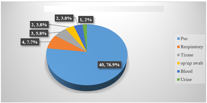 The total number of non-duplicate Staphylococcus aureus included in the study was 52. The median age of the patient was 43.5, ranging from 0-85 y. Males were 28 (53.8%) and females were 24 (46%). 32 (61.5%) Staphylococcus aureus were isolated from inpatient wards and 20 (38.5%) were isolated from OPD patients. A maximum number of Staphylococcus aureus was isolated from the pus sample. The sample-wise distribution of Staphylococcus aureus is shown in fig. 2.