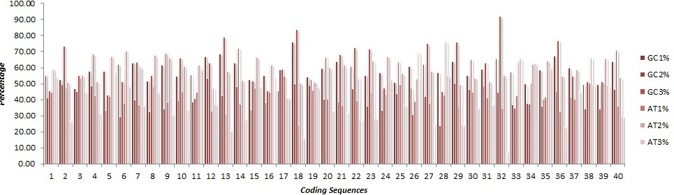 The GC content levies constraints on the codon usage and thus may indirectly affect the translation process. The %GC and %AT contents at their three respective codon positions and overall %GC and %AT content of cds are depicted in fig. [1].