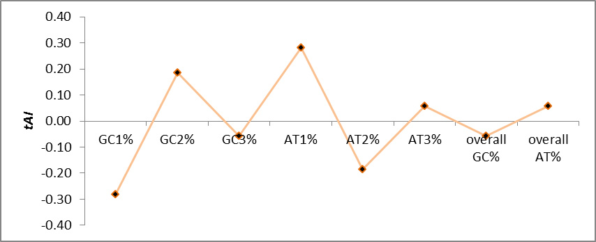 Fig. 2: Correlation analyses of %GC and %AT at three different codon positions with tAI