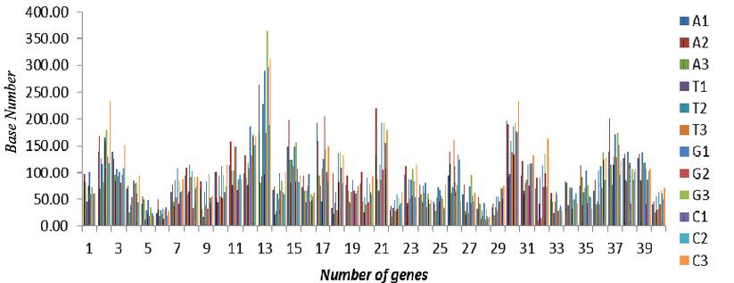 Fig. 3: Distribution of bases at three codon positions in 40 cds of Homo sapiens