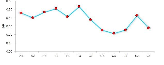 To detect possible relationship between the base composition at different synonymous codon positions and tAI, the estimated values of the four nucleotides adenine, thymine, guanine and cytosine were compared with tAI value of each coding sequence. The correlation coefficient (r) of the positional attributes of the nucleotide bases with tAI were moderately higher for T3 (r=0.52**) followed by T1 (r=0.51**), and showed trifling lower values in the other positions of nucleotides in the synonymous codons. G3 (r=0.209) had the least influence of the codon usage bias, which implied that the preference of nucleotide composition on the synonymous codon usage might have a role in altering the degree of gene expression. The base compositions were most likely influenced by thymine in first and third positions of synonymous codons. Fig. [4] shows the correlation coefficient values of tAI with the nucleotide bases at three codon positions in the human genes.