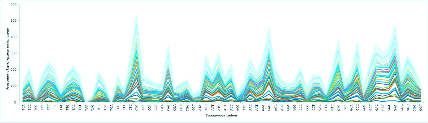 The number of each codon in the coding sequences was analyzed as depicted in fig. [5]. The average of all the codons was calculated and it was found that the codons GAA (avg. =14.74), CTG (avg. =13.19), CAG (avg. =12.61) and AAG (avg. =12.60) have higher average values than the rest of the codons. It reveals that these specific codons more frequently used.