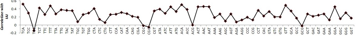 Fig. 6: Correlation of 61 codons with tAI