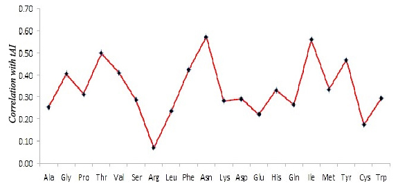 Fig. 7: Correlation of amino acids with gene expressivity measure tAI for cds of Homo sapiens
