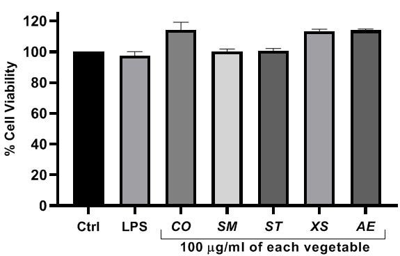 Fig. 1: Effect of vegetables on the viability of RAW 264.7 cells. RAW 264.7 cells were treated with the highest vegetable concentration (100 µg/ml) for 30 min before incubating with LPS (50 ng/ml). The data represent means±SD of three independent experiments. There was no significant difference between the control and each treatment.