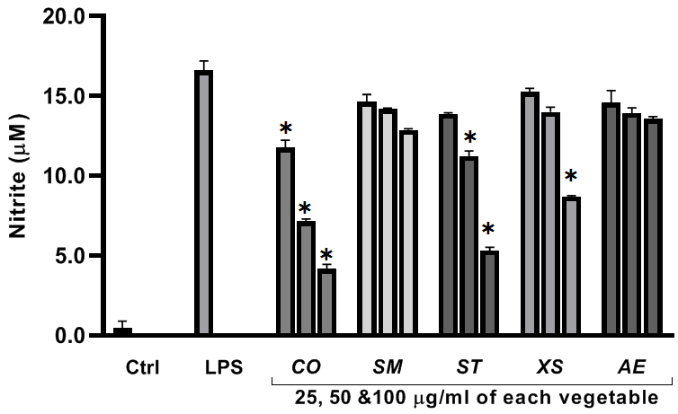 Fig. 2: The effects of the vegetables on the production of nitrite in LPS-stimulated RAW 264.7 cells which were untreated (C), treated with only 50 ng/ml LPS (LPS), pre-treated with vegetables at concentrations of 25 to 100 𝜇g/ml. The data represent means+SD of three independent experiments (y=0.0225x+0.0104 R2=0.9998). *P<0.05 represents a significant difference in NO compared to the cells treated with extracts and only LPS