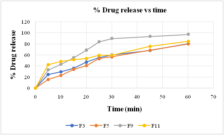 The data in table 13 make it clear that the drug's dissolution profile significantly increased as a result of the drug's improved solubility in the hydrophilic carriers. The presence of the super disintegrant may also be responsible for the quicker disintegration. In contrast to the pure drug film, which only showed a release of 44.04±1.963 % after 10 min, the optimised film demonstrated a maximum drug release of 98.92±0.651%.