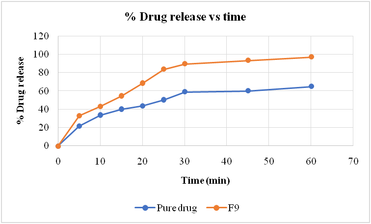 Solubility of the pure drug and optimised solid dispersion (F9) was determined by adding a known excess amount of pure drug and solid dispersion to 10 ml of dissolution medium (phosphate buffer pH 6.8), respectively. The dispersion was held at room temperature for 48 h on the rotary shaker before being filtered with Whatman filter paper and analysed with a UV-Visible spectrophotometer at a maximum wavelength of 228 nm [14].