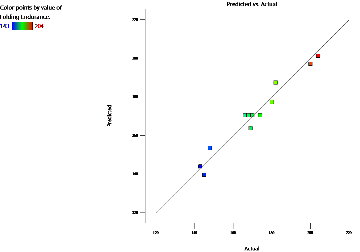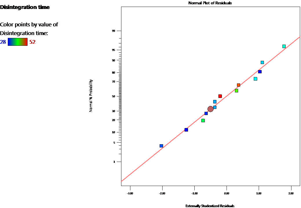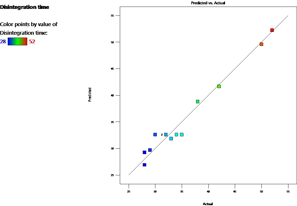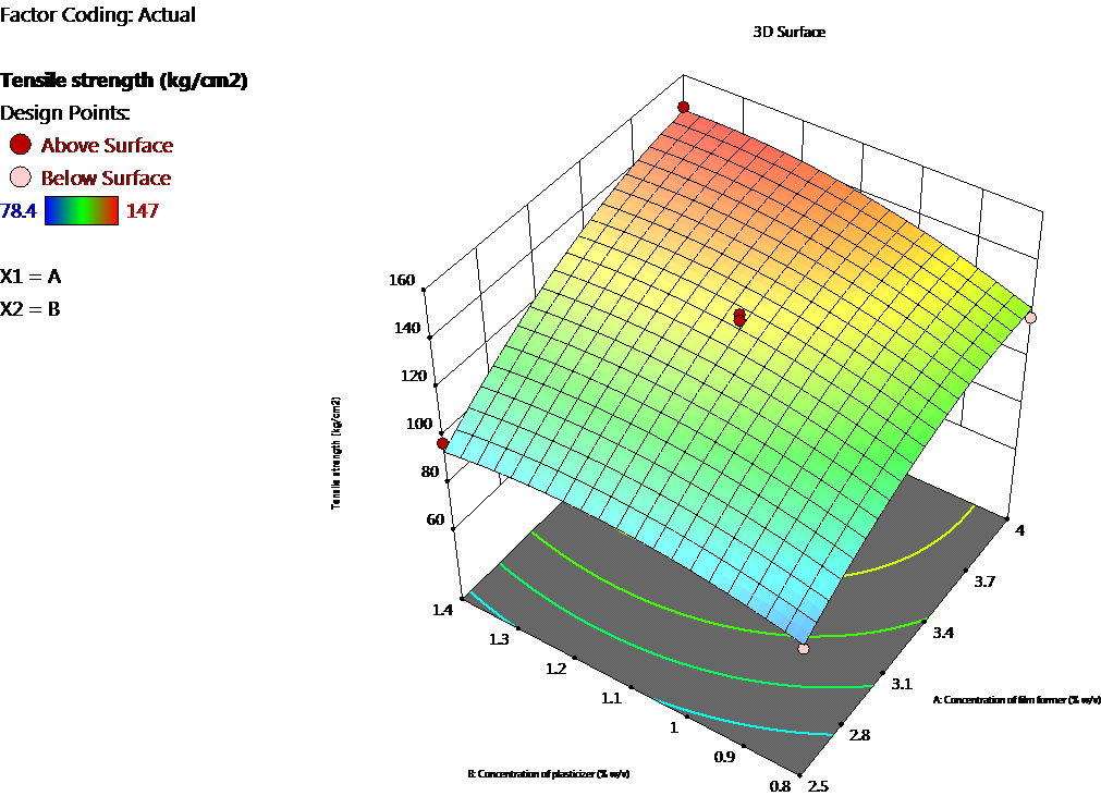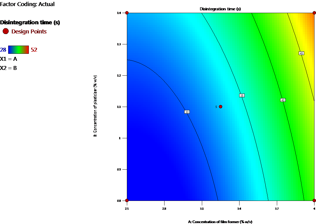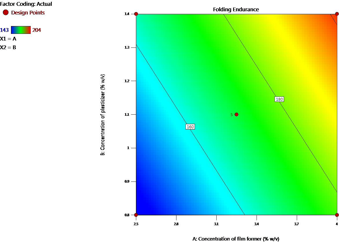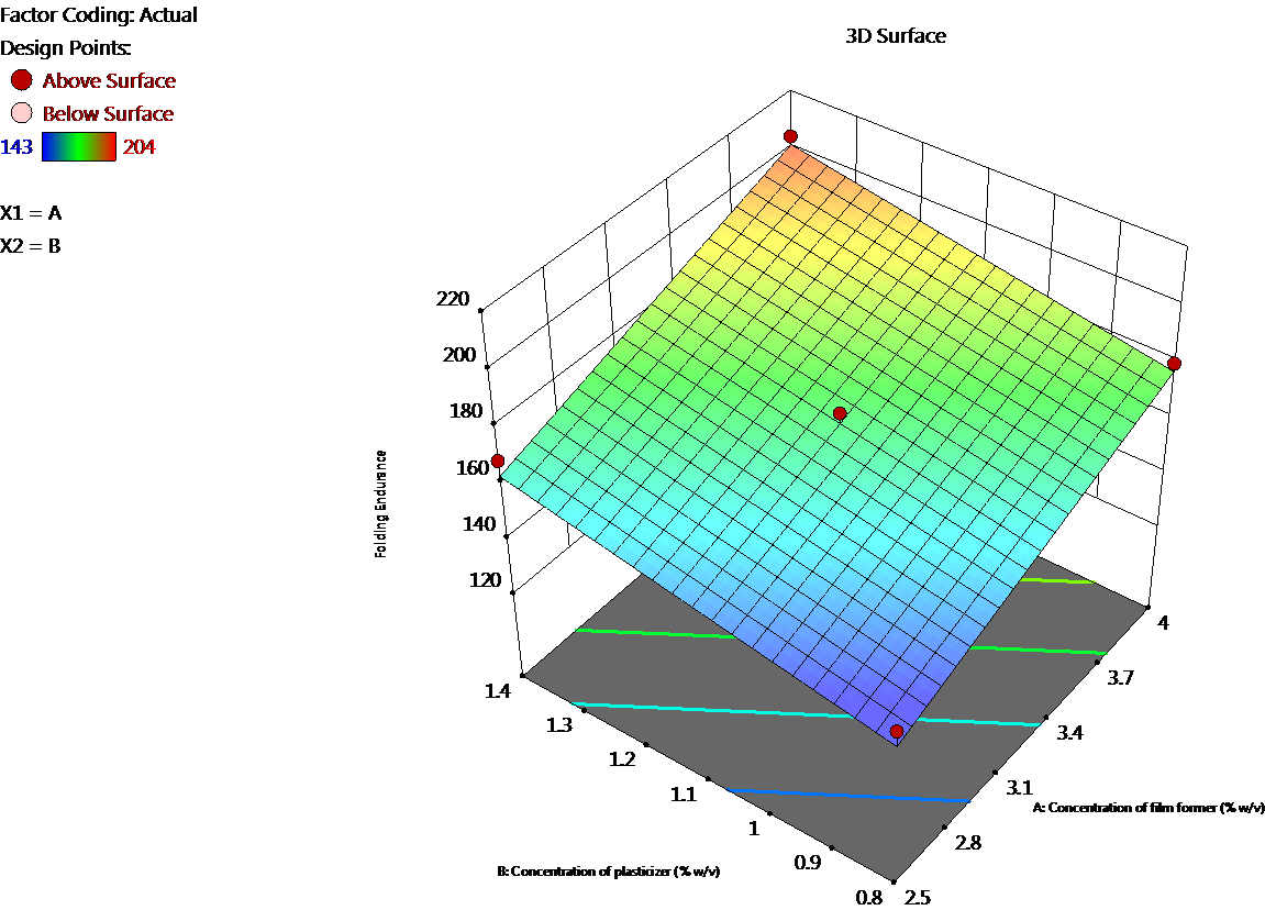 The two-factor five-level central composite design was employed to optimize the compositions of the excipients used for film formation. The two factors that are independent variables: concentration of film former (HPMC E-5) and concentration of plasticizer (PEG 400) were evaluated for their effect on disintegration time, folding endurance, and tensile strength. A total of 13 runs were generated at five different levels that are-α, −1, 0, 1, and+α and 5 centre points [16].