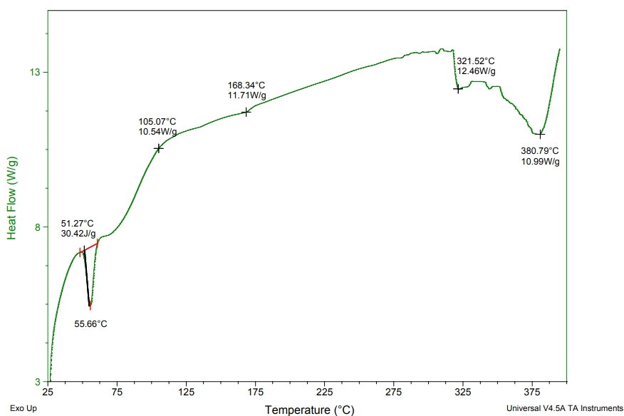 DSC analysis of the pure drug and optimised solid dispersion (F9) sample was conducted using a thermal analyser by heating the samples from 30 °C to 300 °C in an inert atmosphere at a rate of 10 °C/min. The sample was analysed using an empty sealed aluminium pan as a reference.