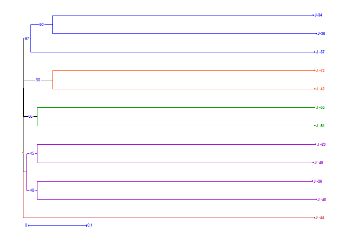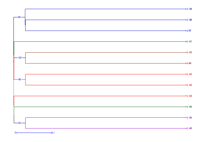 The accessions under study were broadly divided into four major clusters (fig. 2). Each cluster was representing the grouping of twelve S. cumini accessions according physical attributes. Cluster I included three accessions namely J-37, J-36 and J-34 that appears to distinct as compared to other clusters. All the accessions of this cluster grouped together according to their respective geographical origin as they are the selections from the Mohanlalganj, Lucknow (UP). These accessions have all most same physical characteristics. Cluster II has two accessions that include accessions J–23 and J–49 grouped in the same cluster as they having similar physical attributes. However, these accessions belong from different location of Lucknow (UP). The cluster III comprises two accessions J-42 and J-43 which grouped together according to their unique characteristics of seedlessness as well as they belong to same geographical origin from Varanasi, U. P. The accessions J-51 and J-55 were grouped together in a cluster III however, they related from different geographical regions. The accession J–51 from Godhra region of Gujrat and J–55 from Konkan region of Maharastra grouped in a same cluster because these accessions having similar morphological characteristics. Cluster IV contained accessions J–26 and J–40 were grouped together in the same cluster as they have similar physical characteristics as well as belong to the same geographical origin of Kankaha, Lucknow. These accessions are characterized by big canopies, producing small fruit, bold seeded, less pulp content, low TSS, low sugar and vit C content. The accession J–44 are quite distinct and separated from other clusters as it is a seedless accession which was originating from Periyakulum region of Tamil Nadu. Bootstrap values above 60 are shown in dendrogram. The cophenetic correlation values for dendrogram were used to test for the goodness-of-fit of the clustering to the dissimilarity matrix by computing the cophenetic correlation (r) with 1000 permutations. The cophenetic correlation of the dendrogram and the dissimilarity matrix revealed a good degree of fit (r = 0.977; p<0.001) suggest the cluster analysis strongly represents the similarity matrix.