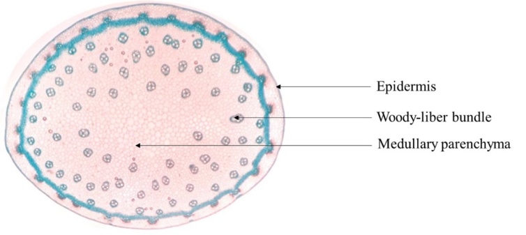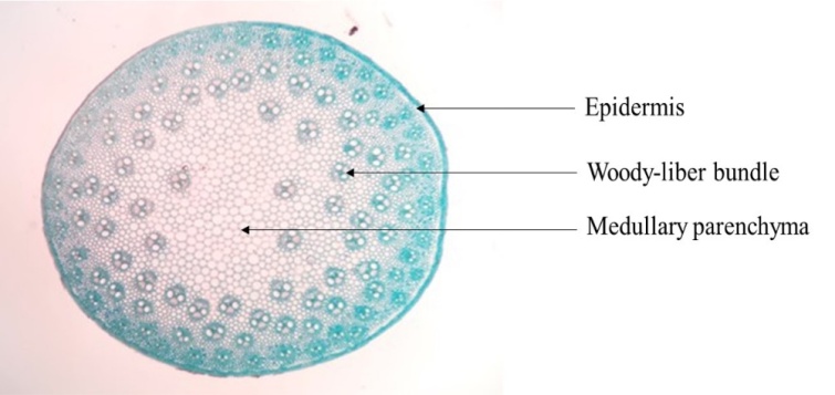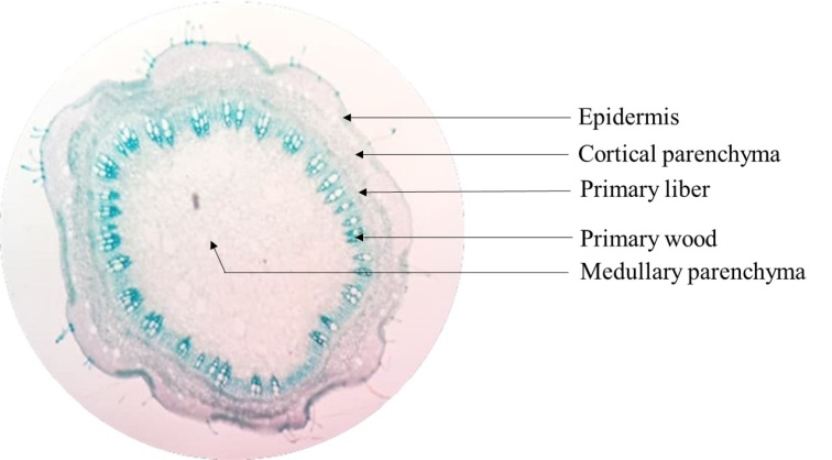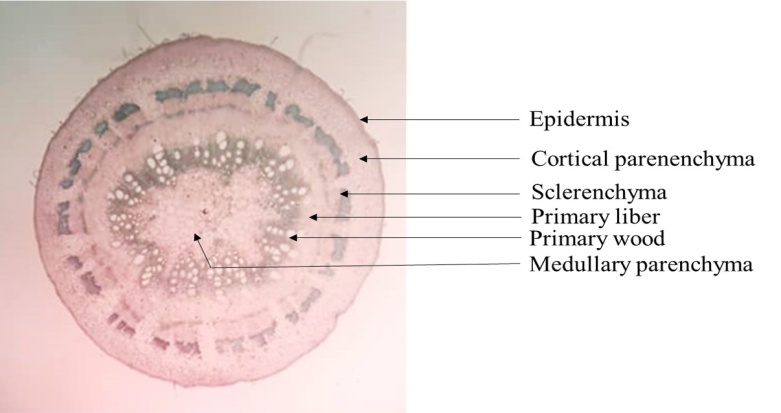 The young and old stems of the plants were harvested and preserved in 30% alcohol. The 1 cm long organ was inserted into sorghum pith or polystyrene. Thin cross-sections were made with a new razor blade. All the sections obtained were soaked in diluted bleach or sodium hypochlorite for 20 min followed by a rinse with ordinary water. The sections were then soaked in acetic water for 15 min to neutralise the excess bleach, which is chemically basic and makes the cell walls receptive to the dye. After this step, the sections obtained were stained with carmino-green (a mixture of carmine alumina and iodine green) and then rinsed one last time with water. Thus, the cell walls were stained according to their chemical nature (cellulosic walls in pink and lignified walls in green). The stained sections were then mounted between slides in a drop of glycerine water [7]. The sections were focused at 40x magnification with a light microscope and observed at 100x magnification. After observation, the different sections were photographed using a mobile phone.