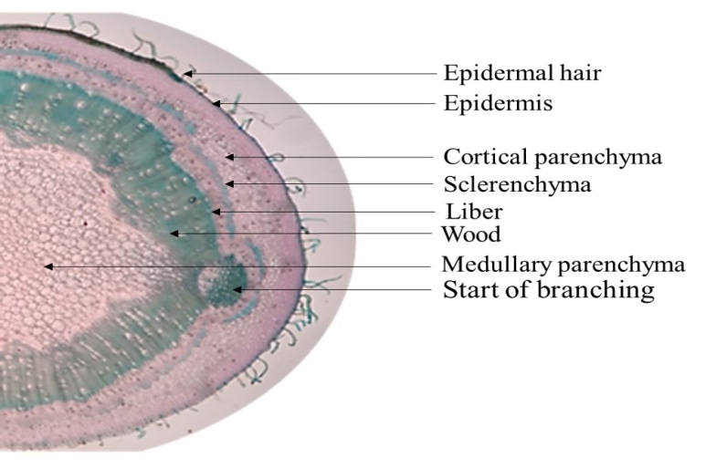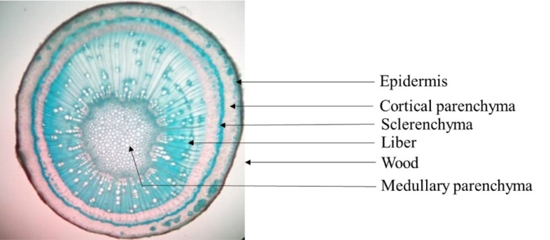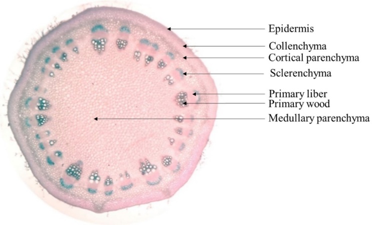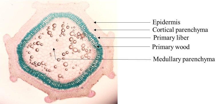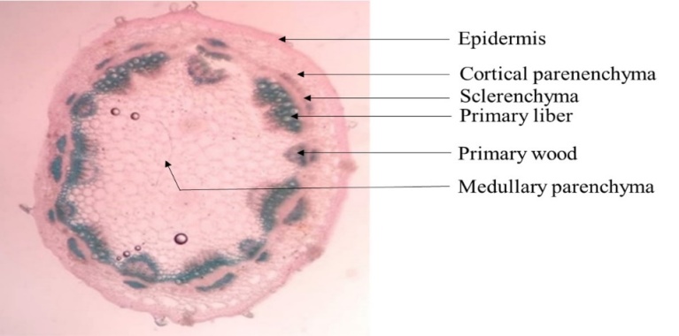 The carmine-green staining made it possible to distinguish different plant stem tissues, arranged according to the colouring, structure, shape and size of the cells in each tissue. Thus, from the periphery to the interior of the organs, we observe the epidermal hairs, the epidermis, the collenchyma, the cortical parenchyma, the sclerenchyma (for aged or more or less aged tissues), the liber or phloem, the wood or xylem and the medullary parenchyma.