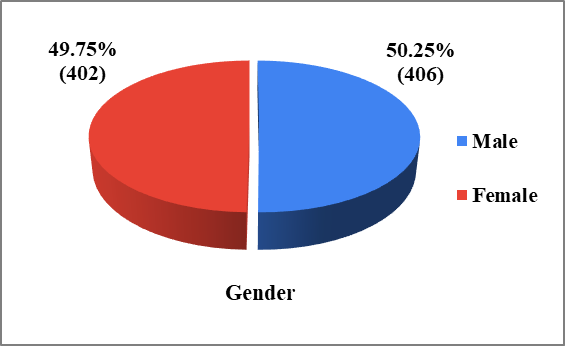 A total of 808 individuals participated in this study, among which male and female participants were 406 (50.25%) and 402 (49.75%), respectively (fig. 1). Most of the responses were from young participants aged between 18 to 25 y (654; 81%), and the other age groups were 26-35 y (95; 11.76%), 36-45 y (30; 3.71%), 46-55 y (23; 2.85%),>55 y (6; 0.74%) old. All participants were from Bangladesh, where 447 (55.32%) were from urban areas, 135 (16.71%) were from suburbs and 226 (28%) from rural areas.