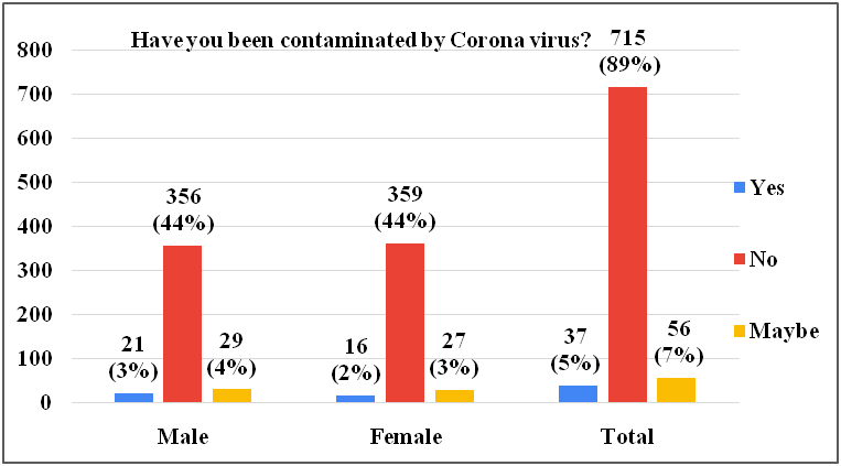 In terms of coronavirus contamination, males were 44% (356) and females were 44% (359) of the total participants (fig. 2). We found that only 5% (37) of participants were infected with Covid-19, 89% (715) participants were not infected, 7% (56) participants were unaware of their contamination (fig. 2).