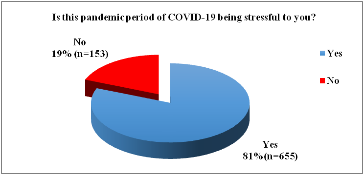 In the present study, 81% (n=655) of the total respondents (n=808) reported being in stress due to the outbreak of Covid-19 (fig. 3). Though only a few of the participants were contaminated by coronavirus, most of them are stressed in this Covid-19 pandemic situation. It has been suggested that the infected and/or uninfected both types of people are stressed due to the pandemic situation of covid-19.