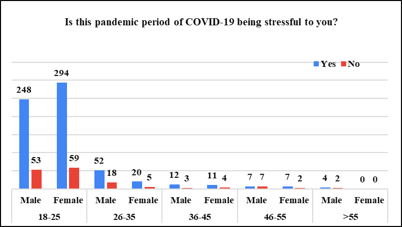 We investigated the various stress condition on individuals of different age groups and gender due to the pandemic situation. We found that respondents from the 18 to 25 age group, 82% (n=248) male and 83% (n=294) female, were stressed. And among the age group of 26 to 35, stressed male and female participants were 74% (n=52) and 80% (n=20), respectively. The rest of the respondents from different age groups showed similar response patterns (fig. 4). It has clearly indicated that irrespective of the age groups, female respondents were more stressed than males. Similar findings were observed in other studies conducted in Asian countries, and results showed that women in Iran, Iraq and China suffered a higher level of stress, anxiety and depression during this period of the covid-19 pandemic [1, 16, 17]. We know that familial responsibilities are more associated with females. So, it is possible that women who were working from home or unemployed suffered the most in the absence of their support staff like cook or maid, as all of their household chores rested on their fragile shoulder during this lockdown period. So, it was an extra burden or stress factor for females compared to males.