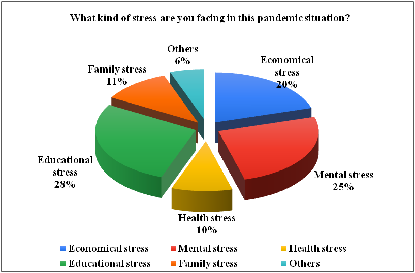 Among the respondents, 28% were stressed educationally, 25% mentally and 20% economically (fig. 5). As the majority of the respondents were between 18 to 25 y old, it justifies the educational stress being more evident. Students are frustrated and depressed thinking about the uncertainty of their future studies as the government has imposed long-term social isolation in the pandemic situation worldwide. Many people are losing their jobs due to this pandemic situation and consequently facing financial and mental stress severely [10].