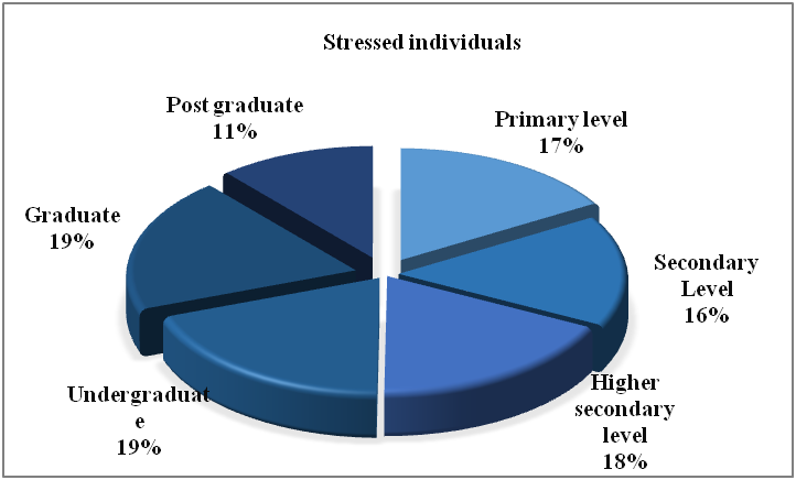 Most stressed people in our study were the graduates (19%) and undergraduates (19%), and out of all education classes and participants with post-graduate education had remarkably lower levels of stress (11%) because of having their permanent job (fig. 6).