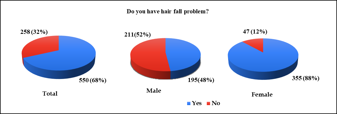We found that a total of 550 (68%) participants had hair fall problems, of which 355 (88%) were female respondents and 195 (48%) were male respondents (fig. 7). This information shows that female individuals were more vulnerable to the hair fall problem than male individuals.