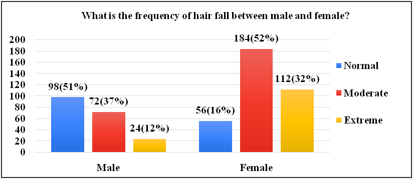 In cases of the frequency of hair fall conditions, a significant percentage of the female reported moderate 184 (52%) and extreme 112 (32%) hair fall conditions than the male respondents of moderate 72 (37%) extreme: 24 (12%) (fig. 8). This result depicts that the female individual had worse hair fall condition than male individuals. Further data revealed that in this pandemic situation, 158 (45%) females were facing increased hair fall problems, whereas only 56 (27%) males responded the same (fig. 9). We observed in the previous section [3.2] that the female participants were more exposed to pandemic stress than male individuals. This ascertains our assumption of the correlation between pandemic stress and hair fall, where women are more prone to be affected by hair fall conditions than men.