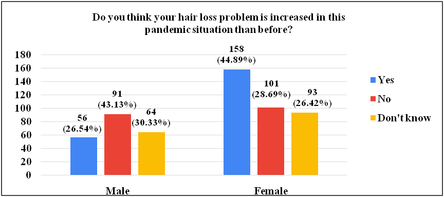Conclusion: In pandemic situations, most of the people (81%) passed through the stressful condition, and the females experienced more hair fall problems than male one. High blood pressure, eating disorder and irregular sleep pattern are considered stress-induced factors that were responsible for increased hair loss.