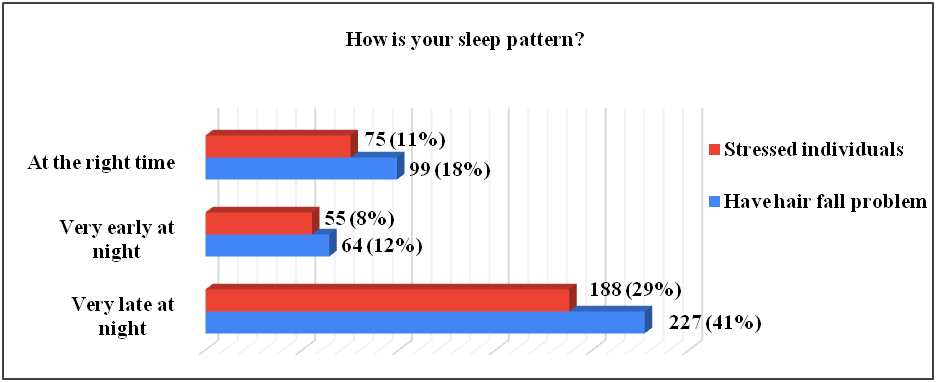 One of the main determining factors of stress is an irregular sleep pattern [20]. Due to this pandemic lockdown situation, people’s daily work routine had become unusual, increased digital screen time and their physical activity also significantly decreased; consequently, their sleep patterns became irregular [21]. Among the participants who sleep very late at night, stressed individuals were 188 (29%) and 227 (41%) were facing the hair fall problem. From the analyzed data, we got that people who sleep very late at night were the most stressed people in the pandemic situations and had a higher hair fall problem than the rest (fig. 10).