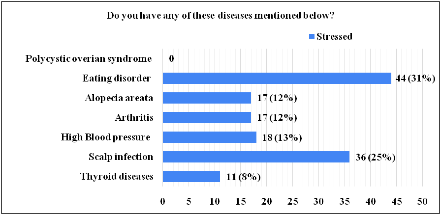 The most prevalent diseases among the people who have covid-19 induced hair fall problems were eating disorders 44 (31%), scalp infection 36 (25%), and high blood pressure 18 (13%) (fig. 11), which in turn dependent upon stress factors [22, 23].