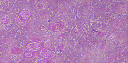 Well-differentiated tumors characterized by the presence of keratin islands with keratin pearls inside. Inside the keratin pearls, the cells are acidophilic with pyknotic nucleus and karyolysis.